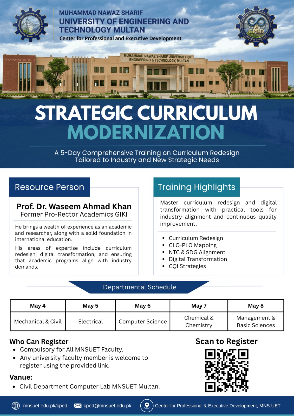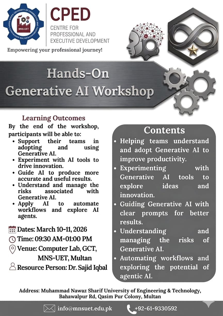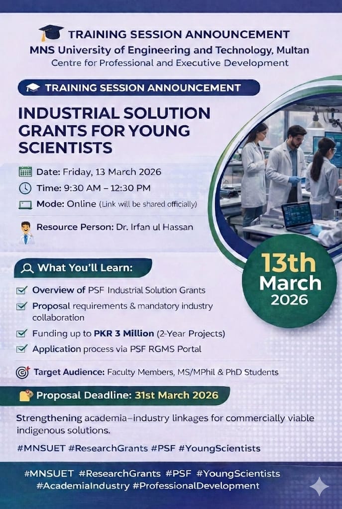It gives me great pleasure to welcome you to Muhammad Nawaz Sharif University of Engineering and Technology (MNSUET), Multan—an emerging institution dedicated to shaping the future of South Punjab through excellence in engineering, technology, management, and entrepreneurship.