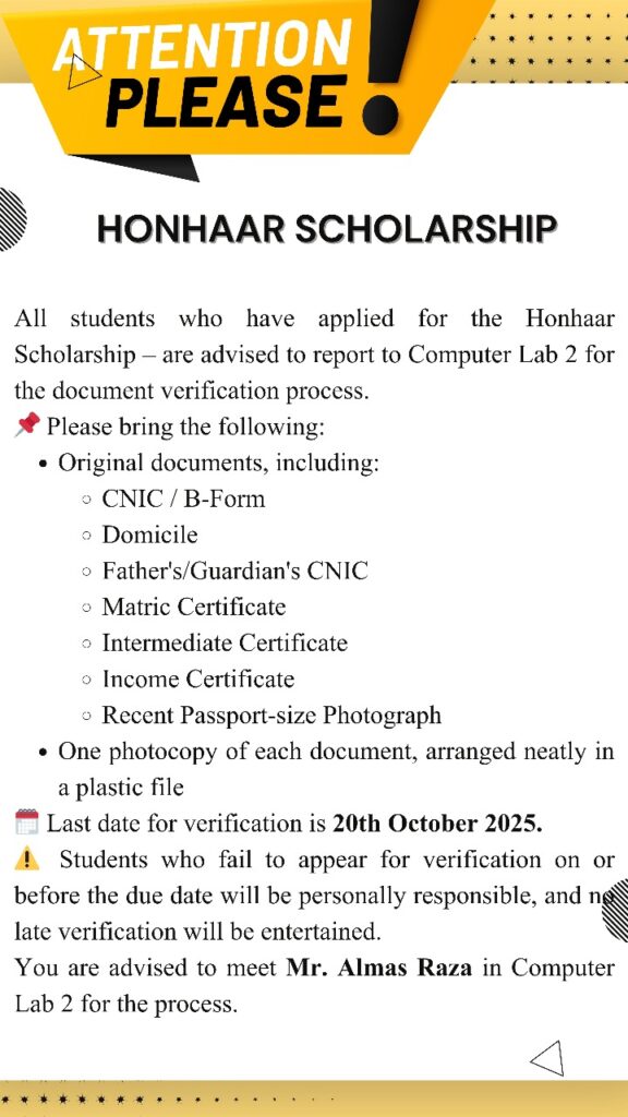 All students who have applied for the Honhaar Scholarship – are advised to report to Computer Lab 2 for the document verification process.