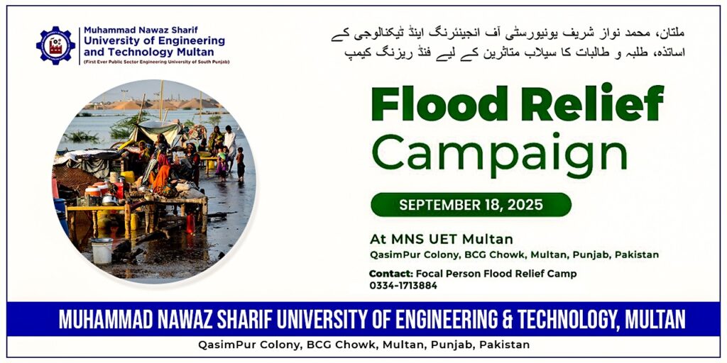 Under the leadership of the worthy Vice Chancellor, Prof. Dr. Engr. Tahir Sultan, the Muhammad Nawaz Sharif University of Engineering and Technology (MNS UET) Multan organized a flood relief camp at Jalalpur Peerwala to assist families affected by the recent floods. The initiative aimed to provide essential supplies, medical aid, and emotional support to the victims.