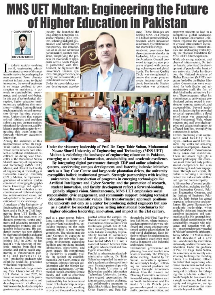 Under the visionary leadership of Prof. Dr. Engr. Tahir Sultan, Muhammad Nawaz Sharif University of Engineering and Technology (MNS UET) Multan is redefining the landscape of engineering education in Pakistan, emerging as a beacon of innovation, sustainability, and academic excellence. By integrating digital governance through ERP and online admission systems, accelerating campus development, and fostering inclusive initiatives such as a Day Care Centre and large-scale plantation drives, the university exemplifies holistic institutional growth. Strategic partnerships with leading universities, the introduction of programs in emerging technologies like Artificial Intelligence and Cyber Security, and the promotion of research, student innovation, and faculty development reflect a forward-looking, globally aligned vision. Simultaneously, MNS UET emphasizes social responsibility, civic engagement, and community support, bridging technical education with humanistic values. This transformative approach positions the university not only as a center for producing skilled engineers but also as a catalyst for societal progress, setting international benchmarks for higher education leadership, innovation, and impact in the 21st century