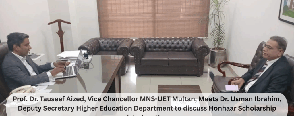 Prof. Dr. Tauseef Aized, Vice Chancellor MNS-UET Multan, met with Dr. Usman Ibrahim, Deputy Secretary Higher Education Department, to discuss matters related to the Honhaar Scholarship program. The meeting focused on facilitating students’ access to scholarships, addressing procedural aspects, and strengthening coordination between the university and the Higher Education Department to ensure timely support for deserving students.
