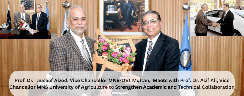 Prof. Dr. Tauseef Aized, Vice Chancellor, MNS-UET Multan, held a productive meeting with Prof. Dr. Asif Ali, Vice Chancellor, MNS University of Agriculture, to explore avenues for mutual cooperation in technical education, research, and faculty development. During the discussion, both leaders emphasized the importance of inter-university collaboration to promote innovation, applied research, and skill-based learning for students. Prof. Dr. Tauseef Aized highlighted MNS-UET’s vision for advancing engineering education and industry linkages, while Prof. Dr. Asif Ali shared insights into agricultural research initiatives and opportunities for joint projects. The meeting concluded with a shared commitment to developing collaborative programs that will contribute to regional development and academic excellence.