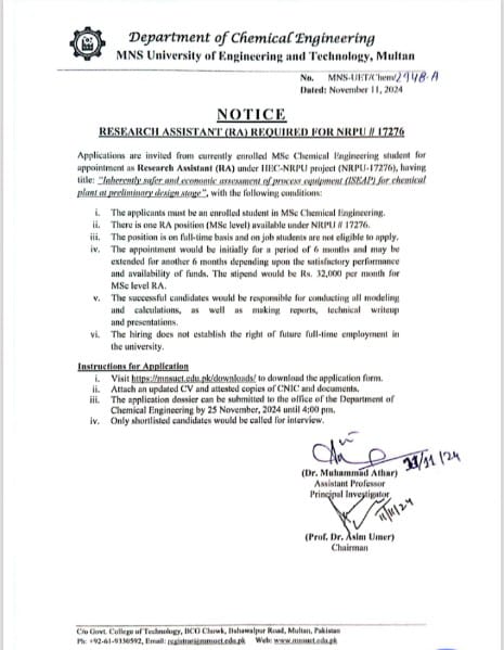 The two research assistants are required for the HEC funded Project, starting from the August 16, 2023, on flow batteries for the initial duration of 6 months and can be extendable based on performance. The applicant must be a MS enrolled student in the chemical Engineering Program; and a monthly stipend of 20000-/Rs will be paid to selected candidates.