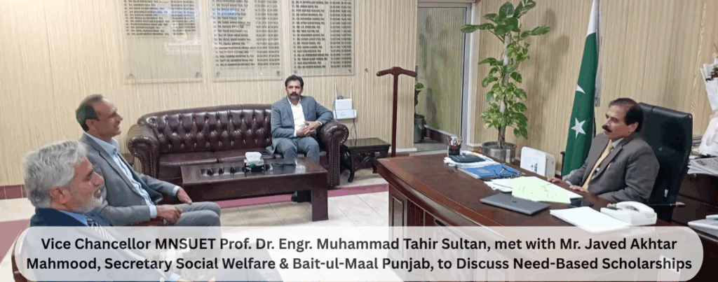 The Vice Chancellor of Muhammad Nawaz Sharif University of Engineering and Technology (MNSUET) Multan, Prof. Dr. Engr. Muhammad Tahir Sultan, met with Mr. Javed Akhtar Mahmood, Secretary Social Welfare & Bait-ul-Maal Punjab, to discuss the provision of need-based scholarships for poor and deserving students of the university. The meeting focused on exploring financial support mechanisms to promote equal access to higher education and to support talented students facing financial constraints, reflecting the shared commitment to social welfare and inclusive academic development.